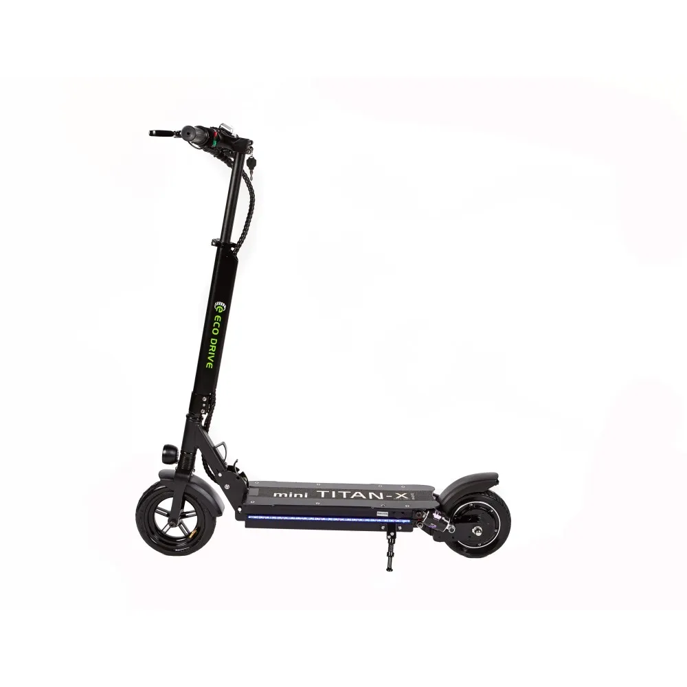 Eco Drive Mini имеет задний привод, мощность двигателя 500 Вт, он позволяет развивать максимальную скорость движения 50 км/ч. Транспорт маневренный и резвый. За счет емкого аккумулятора в 24 А*ч, электросамокат может проехать до 60 км пути. Агрегат отлично подойдет для повседневных поездок на работу, по делам, просто для активного отдыха.