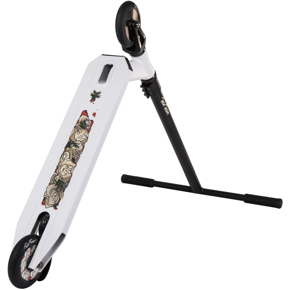 Модель рассчитана для пользователей с ростовыми характеристиками 150-165 см. Рулевая часть T- образная, регулируется. Пластиковые грипсы не скользят, полностью повторяют анатомические части райдера. Дека самоката  представлена прямоугольной формой, не скользит благодаря шкурке. Полиуретановые малостираемые колеса с высокой степенью отскока предназначены для качественных трюков. Модель проста в управлении, не требует особого обучения. Подойдет для выполнения базовых и профессиональных трейдеров. Поэтому покупателями техники могут быть начинающие пользователи и профи. Для покупки трюкового самоката сейчас предлагаем связаться с менеджером компании по телефону или в онлайн-чате.